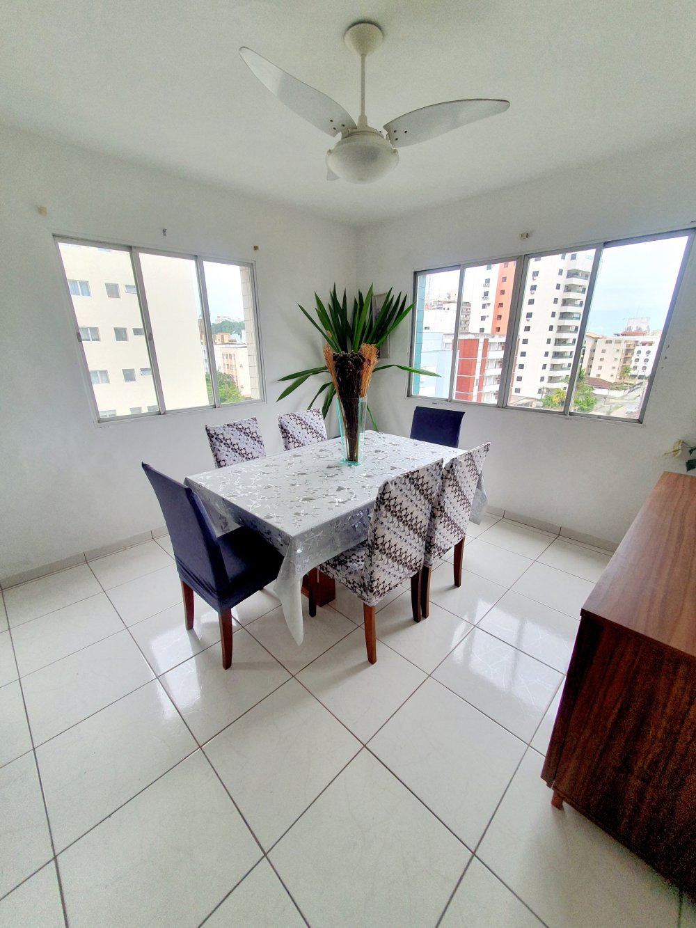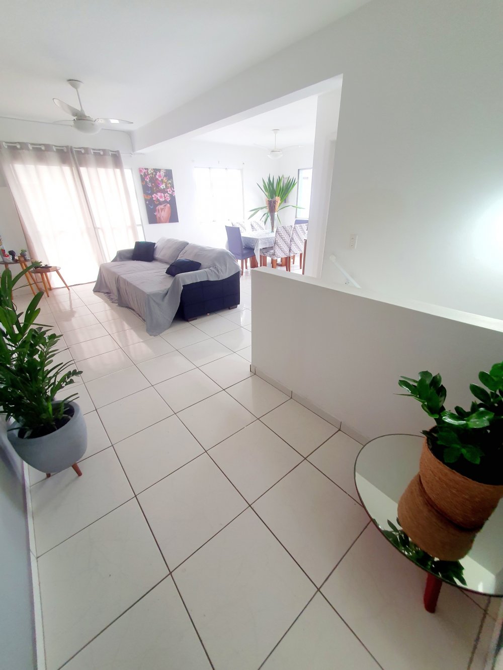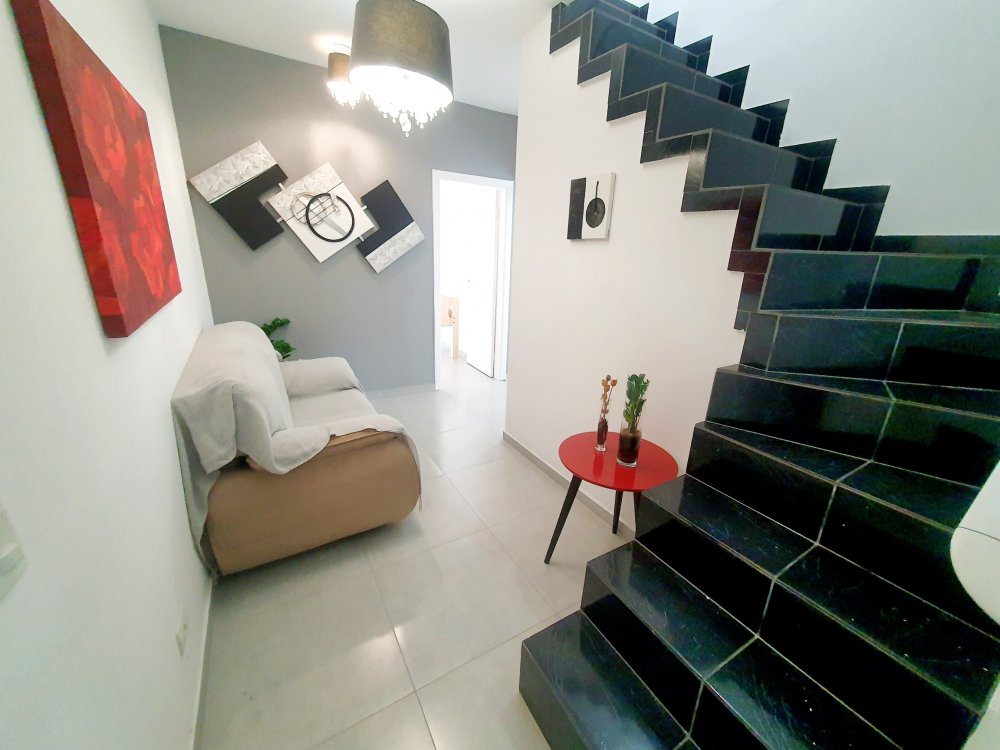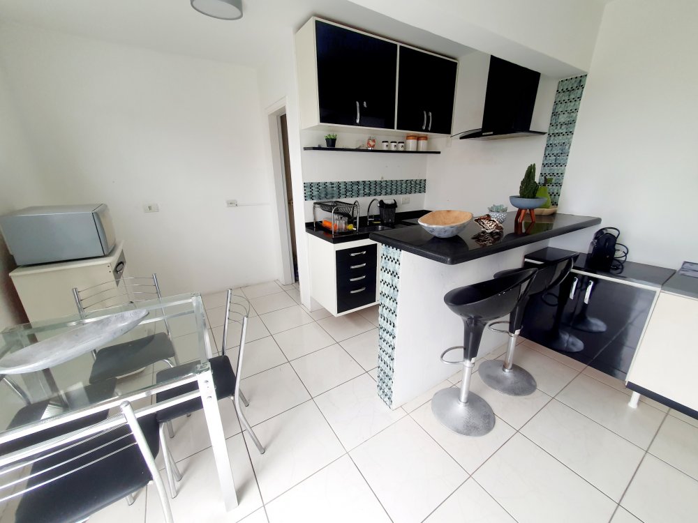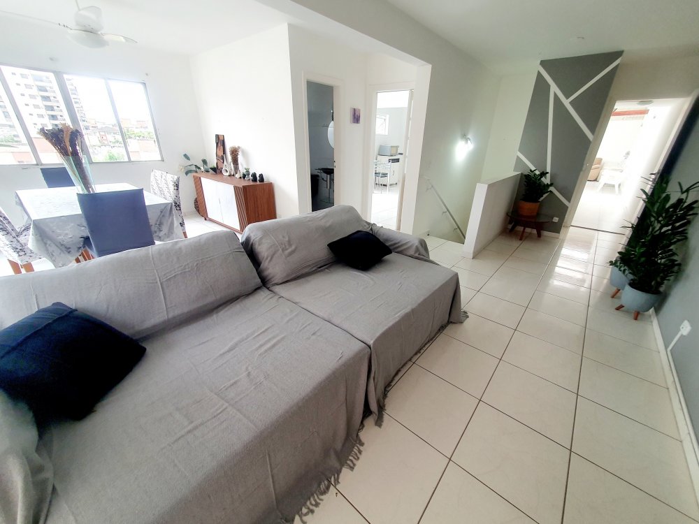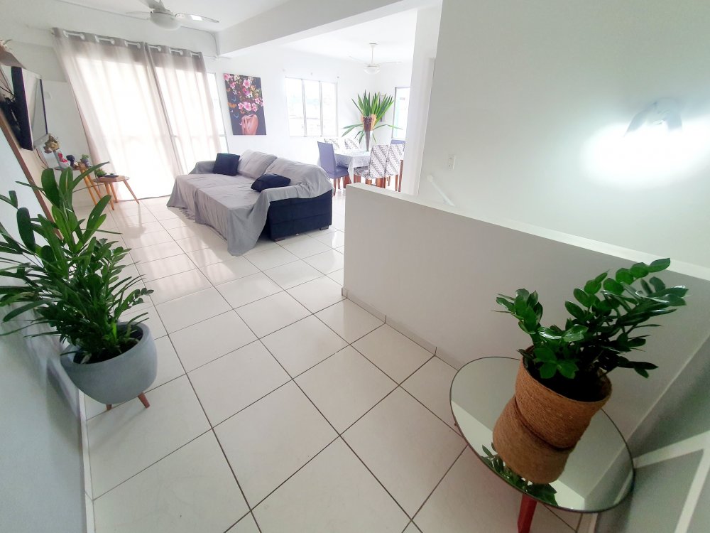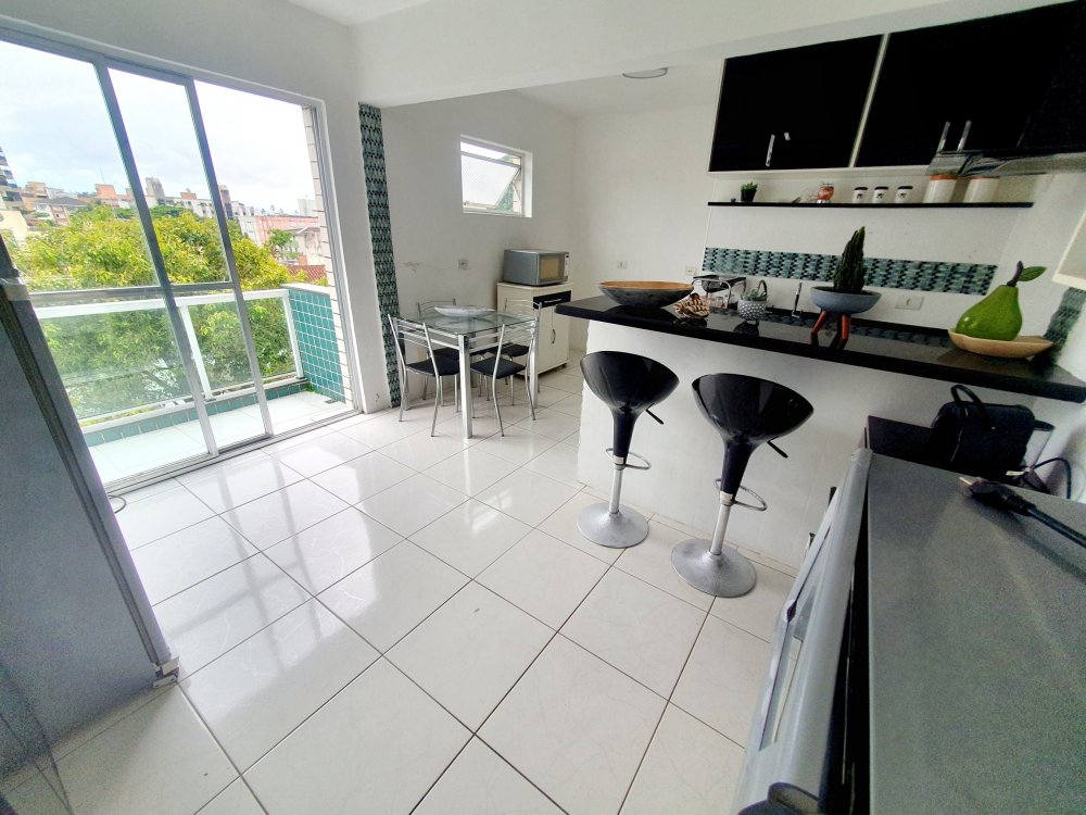 - na parte de cima, sala ampla com janelas e sacada vista mar, cozinha ampla completa