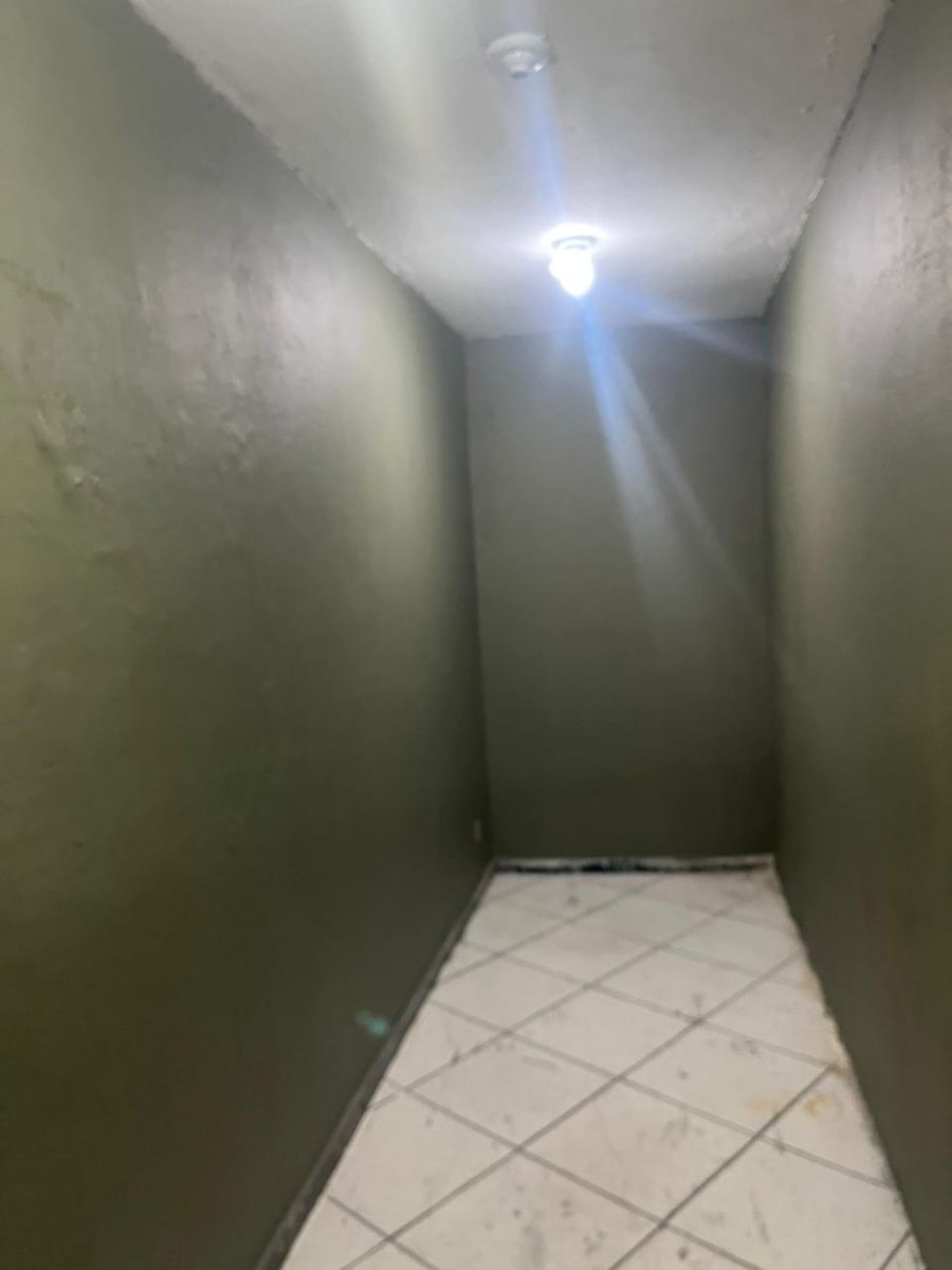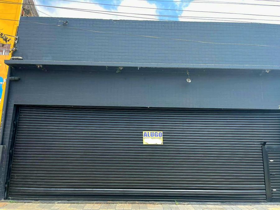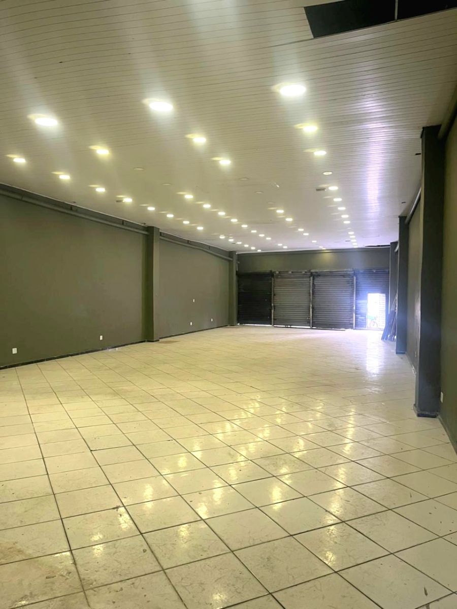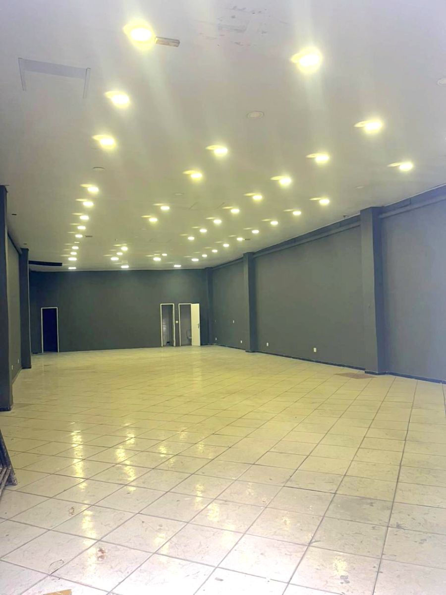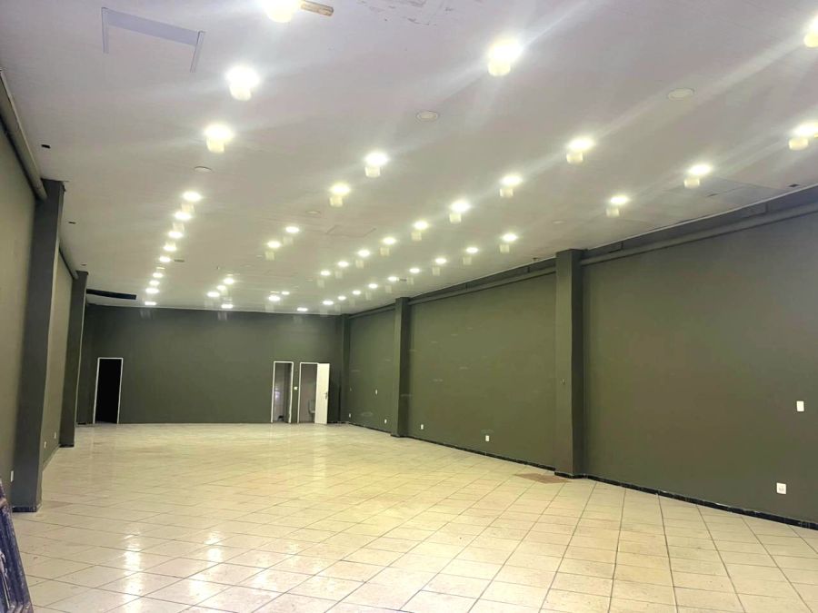 - salão amplo, plano, com iluminação e portas de aço de frente para rua