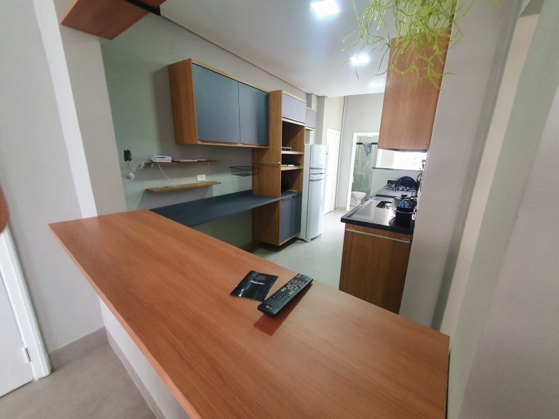 - Cozinha com armários planejados, cooktop e geladeira
