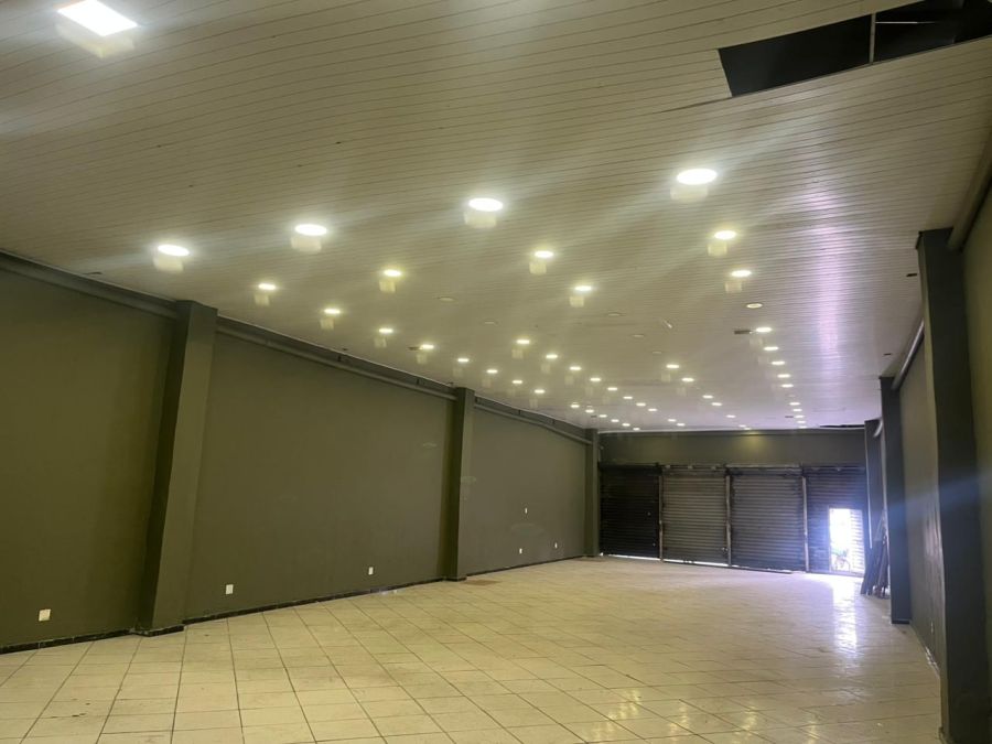 - salão amplo, plano, com iluminação e portas de aço de frente para rua